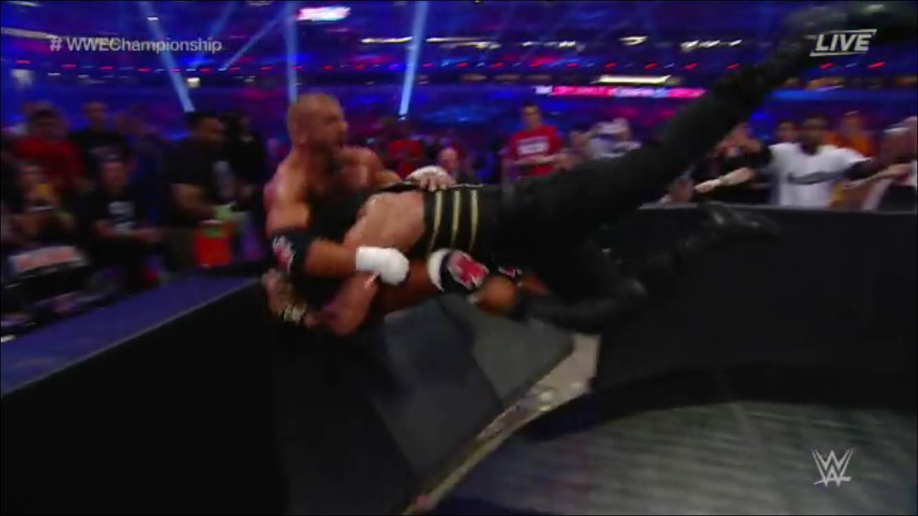 It seemed as no one in attendance was interested in this match at all. The crowd began chanting random things during the match. When Roman speared Triple H through the barricade, the crowd could care less. This match is definitely up there with Triple H vs Randy Orton from WrestleMania 25.