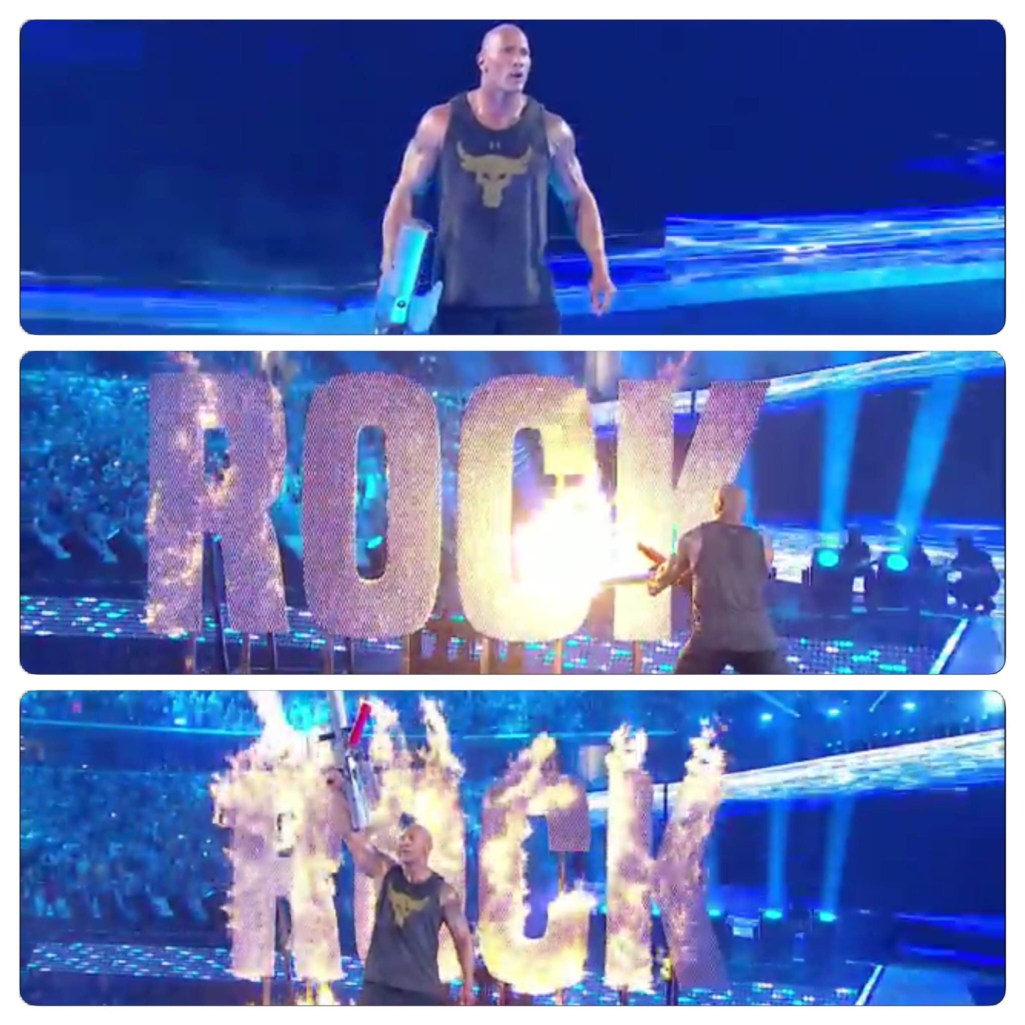 The Rock comes out and does the “I’ve got goosebumps” thing for the millionth time. He also has a flamethrower (at the time this made no sense). He then proceeds to set his name “ROCK” on fire. Don’t know who thought this entrance was a good idea. It took about 3 minutes for PA’s to set up the ROCK sign. While this happened, Rock would walk from one side to the other showing off the flame thrower to the live audience.
