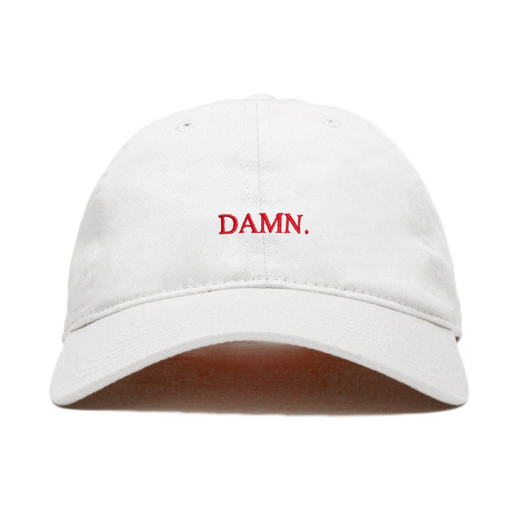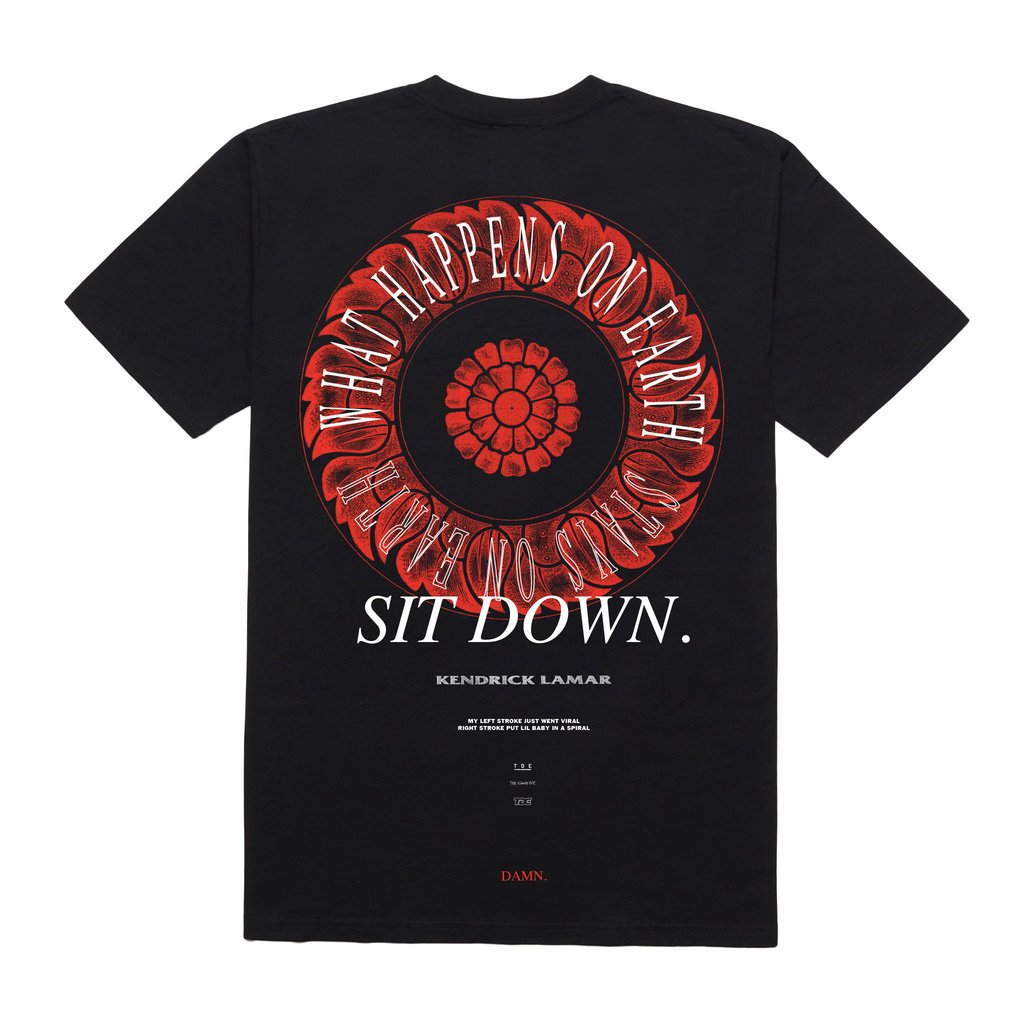 This time around the merch features three dad caps (White, Black, and Maroon), with “DAMN.” lettering, two hoodies (Maroon and Grey), and a t-shirt that reads “BE HUMBLE” on the front and a huge graphic on the back, with one of the most memorable lines from the album, “Whatever happens on earth, stays on earth”.