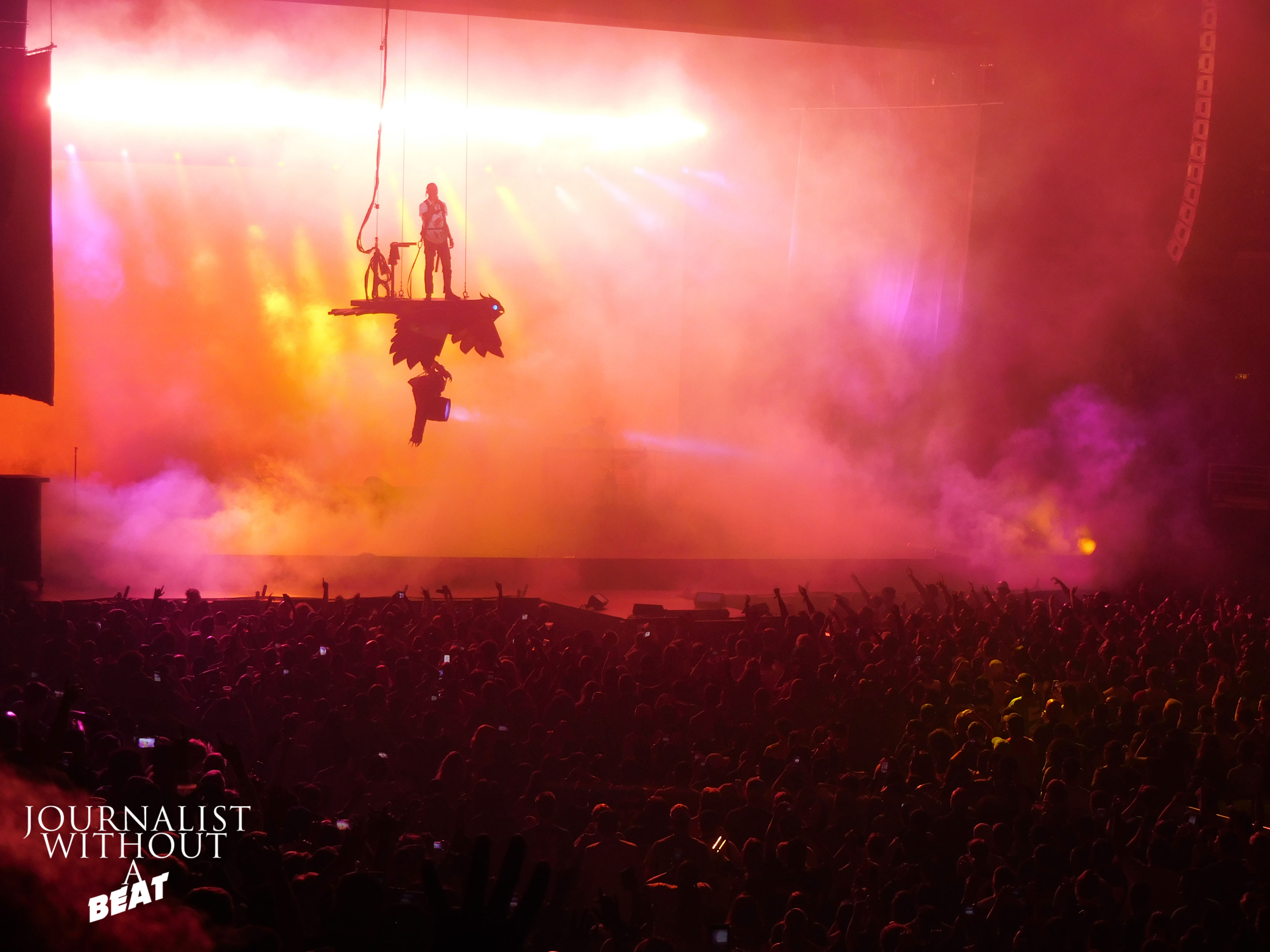 Next up was Travis Scott and that could only mean one thing, it was time for Chicago to RAGE. Whenever Travis Scott touches down in the Windy city, he’s met with nothing but love and enthusiasm. This performance would be a bit different from La Flame’s previous sets – He would start off on the stage and end up floating above it. From out of nowhere his DJ, Chase B said “What is that up there?” The “that” Chase B was referencing was a large eagle that was making its way down from atop of the arena. For those that don’t know, the eagle does have a name – The name is Jack. Jack was previous seen on Travis’ Birds Eye View tour. This new version of Jack the eagle descended from the top of the stage and would fly Travis Scott over the first rows while he performed.