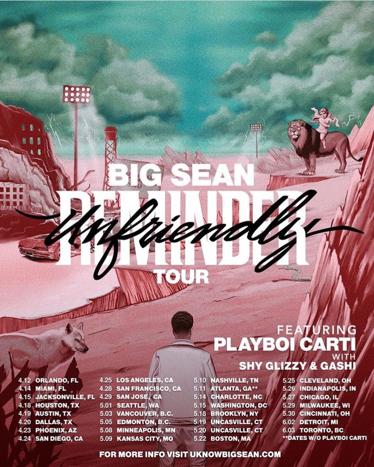 Due to Big Sean currently being in “deep creative space” for his upcoming album, he has postponed all dates on The Unfriendly Reminder Tour. No word as of yet when the tour will be rescheduled.