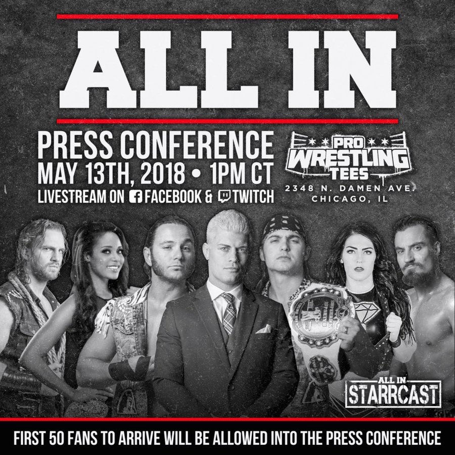 The ALL IN Press Conference is scheduled for May 13th at Pro Wrestling Tees in Chicago. The press conference promises “several match/talent announcements, surprises, ticket info, STARRCAST info, and charity info. Fans looking to attend the press conference may need to arrive to the store early as only the first 50 fans will be allowed in.