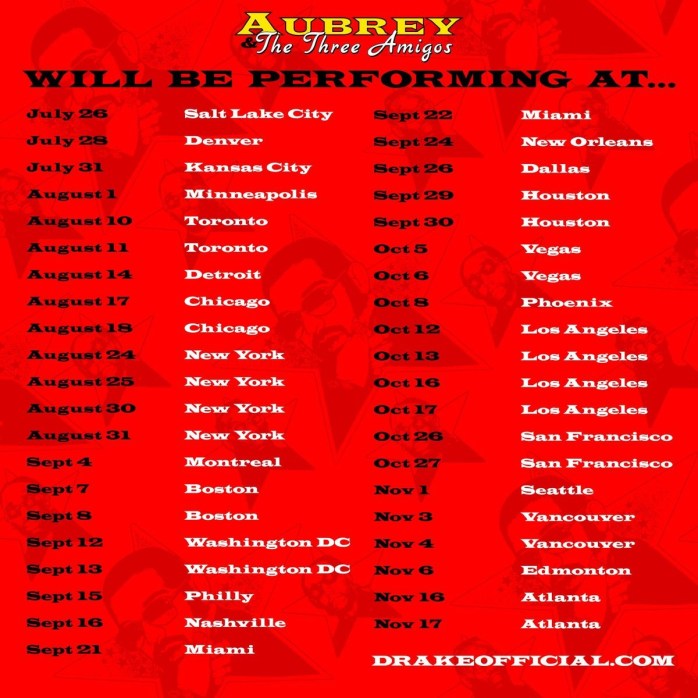 Check out the dates for the Aubrey & The Three Migos tour below